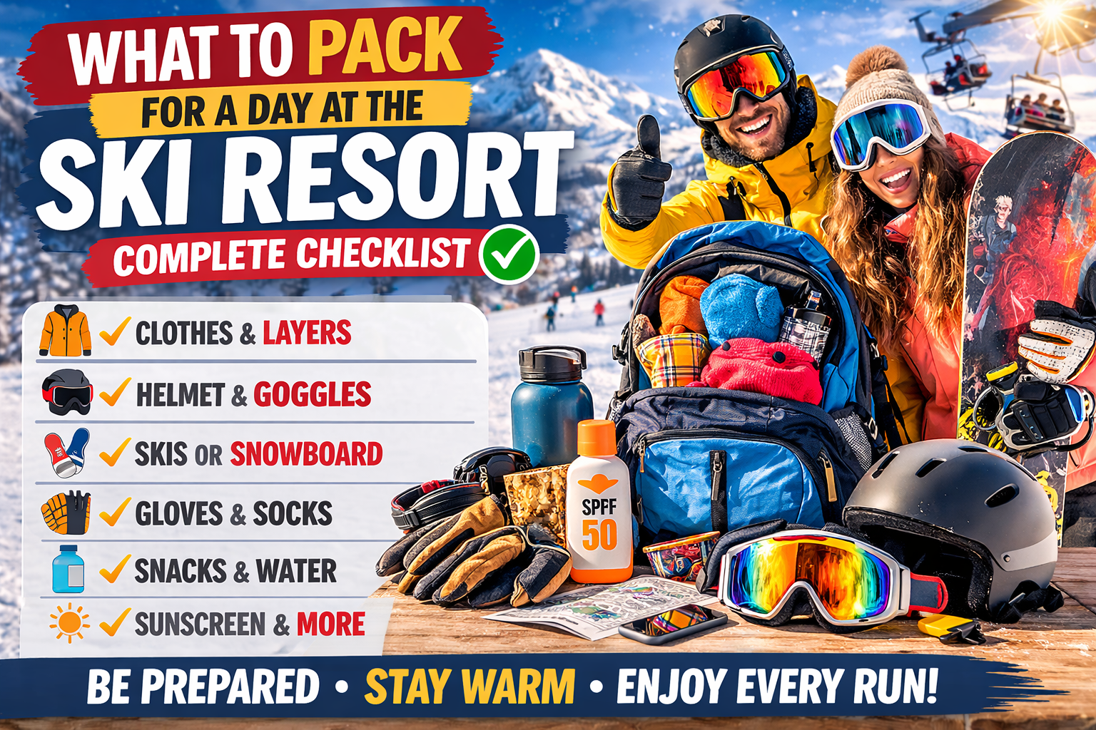 Whether you're skiing or snowboarding, this checklist will help you avoid common mistakes and enjoy your day without unnecessary stress.